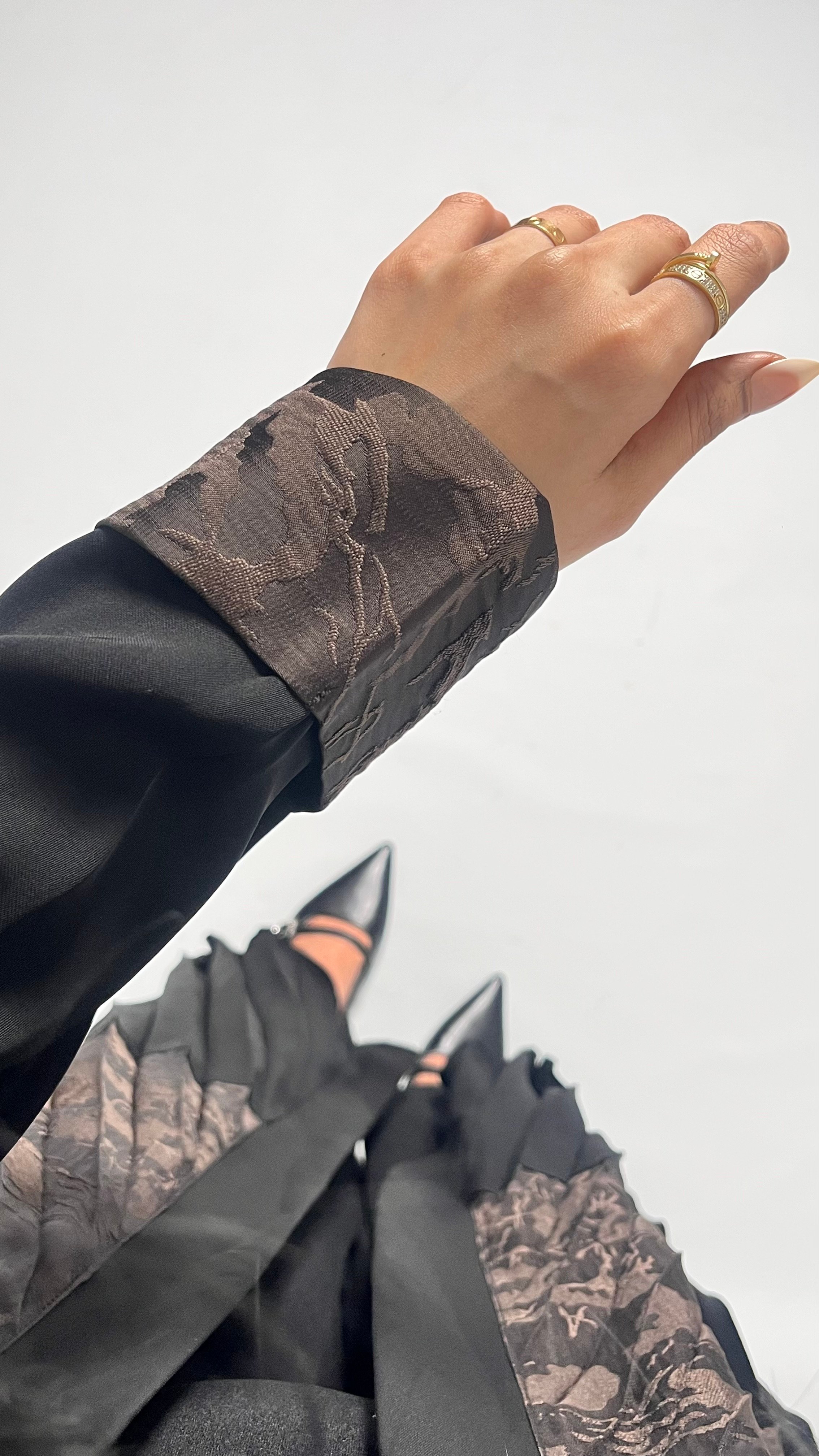 تألقي بإطلالة فريدة مع عباية أريج المصممة بلون أسود ملكي، تجمع بين فخامة القماش اللامع ولمسة الطيات الانسيابية (البليسيه) في التصميم السفلي، لتعكس جمالك وأنوثتك بكل تفاصيلها.